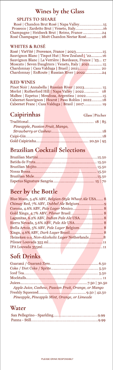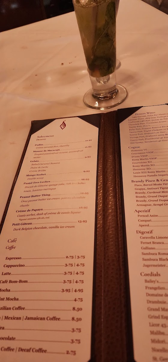 - Desserts: Features traditional Brazilian sweets such as pudim (Brazilian custard), mousse de maracujá (passion fruit mousse), pastel tres leches, petit gateau, flan, gelato with flavors like dulce de leche and crème brûlée, and mango sorbet.